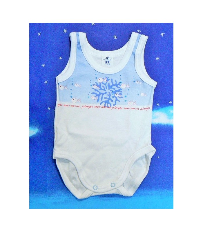 Bodi tirantes para bebé de la marca Abanderado con dibujo de peces y océano. Apertura en la parte inferior, 100% algodón y tallas: