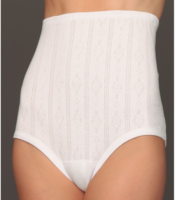 Braga clásica Avet de algodón 100% peinado con dibujo calado de Jacquard. Goma en cintura cubierta y con puntilla en los camales. Color blanco único, talla extragrande