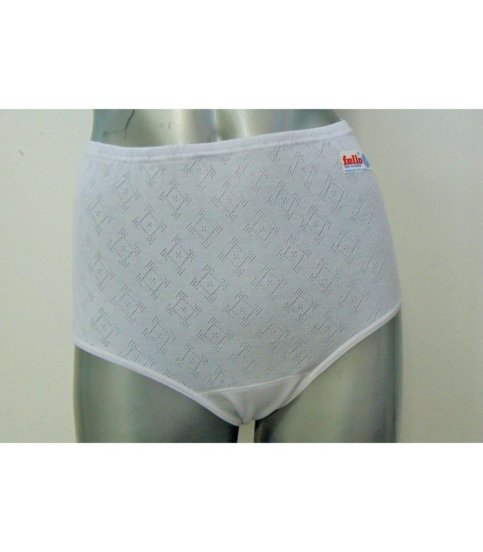 Braga clásica Fello de algodón 100% peinado con dibujo calado. Goma en cintura cubierta. Color blanco único