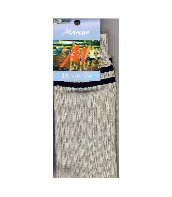 Calcetines clásicos deportivos de la marca Marcor en color gris, rayas superiores horizontales negras y cómodo canalé que aporta transpiración y frescura.