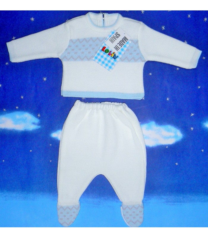 Conjunto cálido para bebé recién nacido en fantasía de la marca Lolin Carrion. Disponible en talla cero (recién nacido) y color único blanco / celeste.