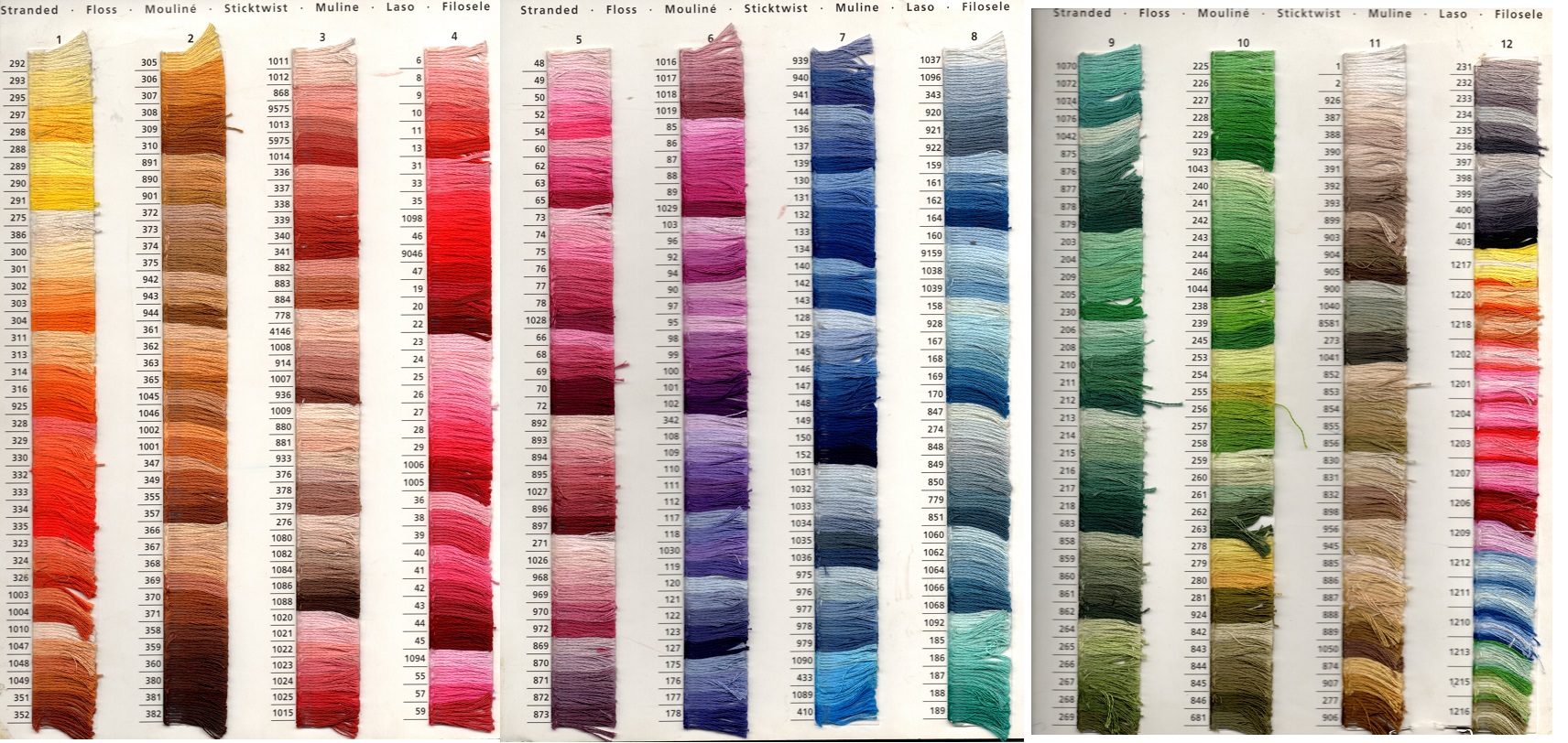 Caja de doce madejas de 8 metros de Mouliné de la marca Anchor. Colores del 8 al 401. Para colores posteriores: