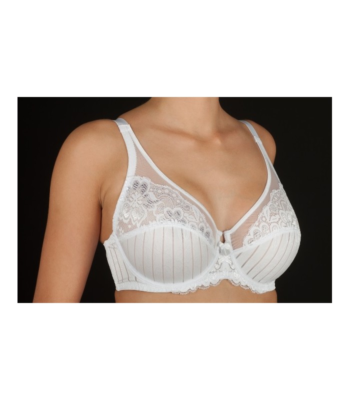 Sujetador con aro que combina un elegante tejido con franjas y copa en tul con encaje.